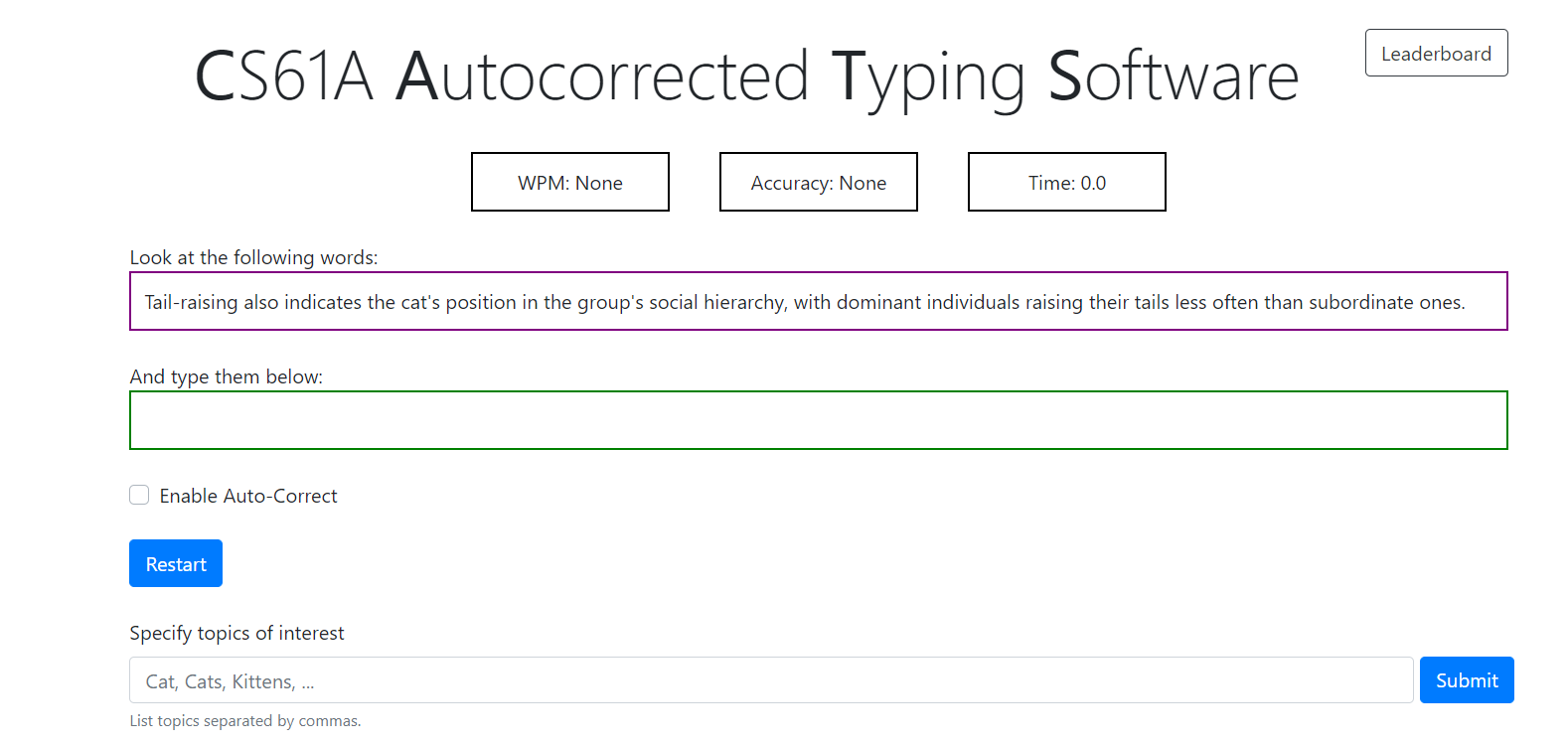 Designed and engineered an Autocorrected Typing Software modeled after Typeracer. Specifically worked on functions to caluculate accuracy and WPM output.